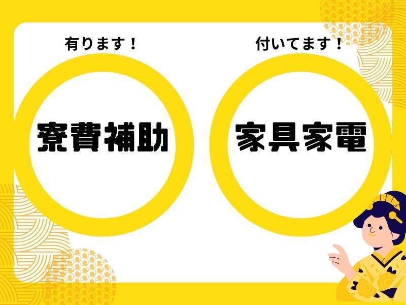 応募資格 | 未経験からでも安心してスタートできます! 実家を出たいけど住まいが… 家具・家電付き寮で、すぐに快適生活スタート! ・即面談→最短で勤務スタート! ・週払い制度あり(規定有) ・初期費用ゼロ、手ぶらで入寮OK! 気になった方はぜひご連絡ください! |